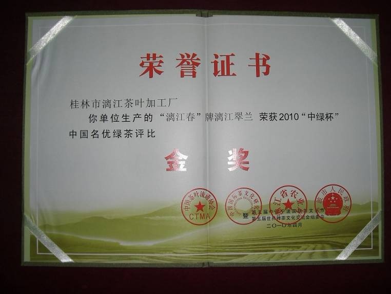 2010年本厂漓江翠兰荣获“中绿杯”中国名优绿茶评比金奖
