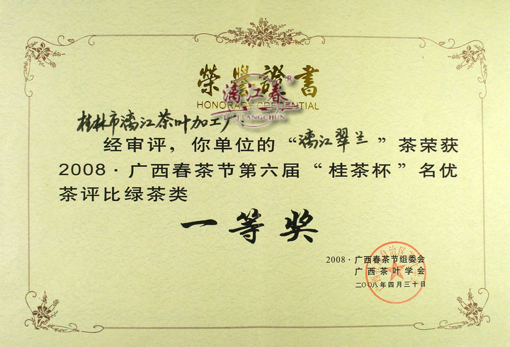 7、“漓江翠兰”荣获2008年广西春茶节“桂茶杯”绿茶类一等奖