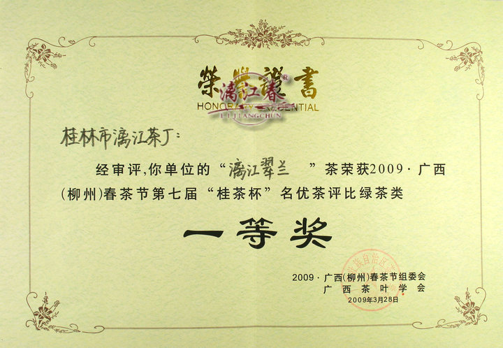 2005年5月我厂生产的漓江春牌绿茶、桂花茶、茉莉花茶等系列产品被中国名优产品推广中心、中国产品质量管理协会授予“中国名优产品”称号。 2006年3月我厂“漓江春”系列茶荣获桂林市“十佳消费者信得过产品”称号。 2006年4月我厂生产的漓江春茶荣获2006年桂绿杯广西名优绿茶评比创新奖。 2007年3月我厂漓江春系列茶荣获桂林市消费者信得过产品称号。 2008年5月我厂漓江春系列茶荣获广西消费者最信赖质量放心品牌 2008年5月我厂0632六堡茶荣获2008广西春茶节桂茶杯特等奖 2008年5月我厂漓江翠兰荣获2008广西春茶节桂茶杯一等奖 2009年我厂漓江翠兰荣获2009广西春茶节桂茶杯一等奖 2010年我厂漓江翠兰荣获2010“中绿杯”中国名优绿茶评比金奖。