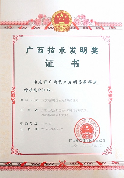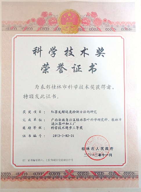 22、本厂与桂林茶叶科学研究所共同研究的红茶发酵适度检测方法荣获广西壮族自治区科学技术奖
