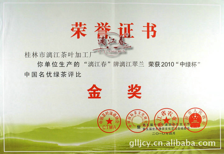 2010年本厂漓江翠兰荣获“中绿杯”中国名优绿茶评比金奖